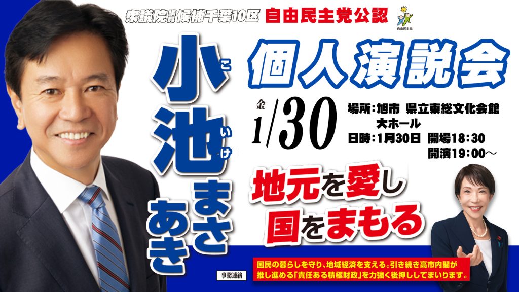 2026-01-29 / 最終更新日時 : 2026-01-29 Chiba10ku お知らせ 1/30 旭市東総文化会館 小池まさあき 個人演説会のお知らせとLIVE配信 本個人演説会のライブ配信を行います。下記リンクをクリックしてご覧いただけます Youtubeライブ配信はこちら