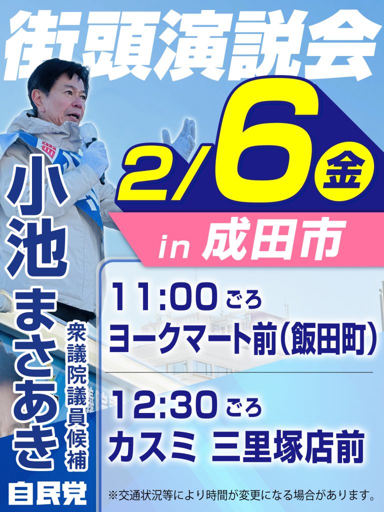 2/6金 成田市飯田町ヨークマート前、カスミ三里塚店前 小池まさあき 個人演説会のお知らせ